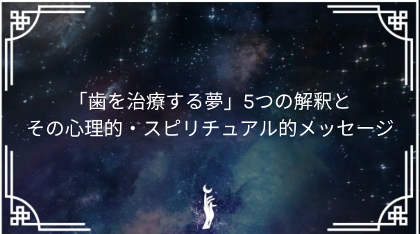 「歯を治療する夢」を見たあなたは、スピリチュアルな観点から見て心の浄化や解放のサインを受け取っているかもしれません。歯は「自己表現」や「力」を象徴しており、この夢はあなたが心の中で感じている不安や制限から解放される準備が整ったことを意味しています。夢占いでは、歯を治す行為が「心の浄化」や「新たな始まり」を示すものとして捉えられています。