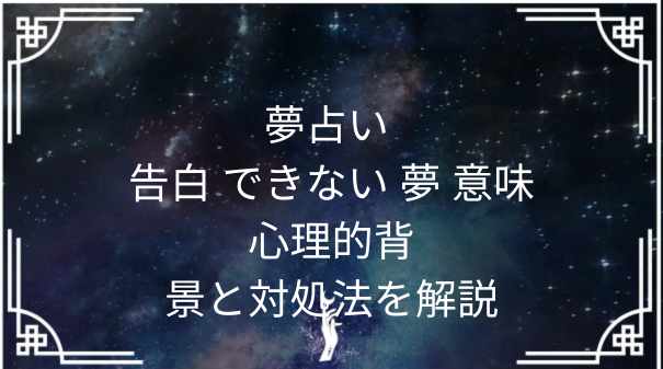 A1: 告白できない夢には必ずしも悪い意味があるわけではなく、実際には自己表現に対する不安や恐れを反映している場合が多いと言われています。この夢が示すのは、現実で自分の気持ちを伝えることに対する無意識の不安であることが多く、心の中で伝えたいことがあるけれど言えない状態が反映されたものです。恐れる必要はなく、むしろその不安に向き合うことで心が軽くなる可能性もあります。